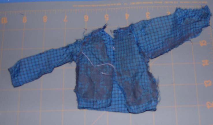 The SM Boys shirt was made out of a blue plaid that had a rubber backing on it. It had gotten old and crispy in some attic and basically was disintegrating as I took it off. His new shirt was made out of an woman's Abercrombie dress shirt that I had gotten for a dollar at Goodwill. I soaked his collar over night in some hot water and Oxyclean and it took all the yellowing out of it.