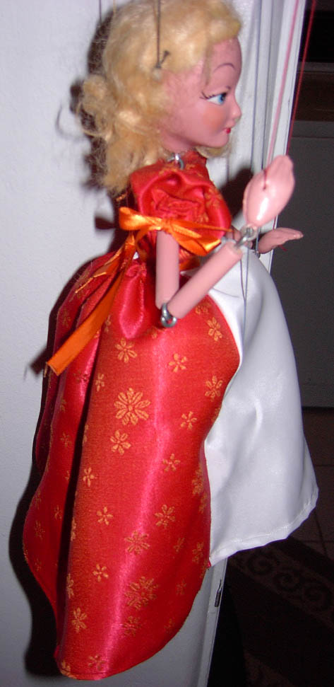 Now let me start off by saying I am not a purist and if you are that is great. As someone had put it on one of the discussion forums. Bob Pelham would be very proud to know that someone has taken to improving his design. So that is the way I feel about some things. Why not try something different and instead of the same pink and white dress. The Cinderella dress that i created is a brilliant red Chinese silk with small orange flowers embroidered on it. I used a orange satin ribbon to tie the waist and as an improvement on the original I used ribbon to create pleats in the sleeves to give it the ballooning look. Then tied the ribbon into small bows. It looks very nice.